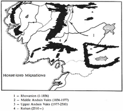 TA 1856-1899: Die Wagenfahrer - Kriege: Rhovanion wird von einem großen Verband an Stämmen der Ostlinge überrandt. Die Nordmänner nennen die Eindringlinge Wagenfahrer, da sie mit Streitwägen und großen Wägen reisen. Marhwini, der Sohn von Marhari, und Huithyn vom Stamm der Gadraughts, vereinigen die sechs Stämme der Éothraim. Zusammen mit Flüchtlingen der Nordmänner, ziehen sie über den großen Fluss und lassen sich in den zentralwestlichen Gebieten des Anduintals, nahe der Schwertelfelder, nieder.